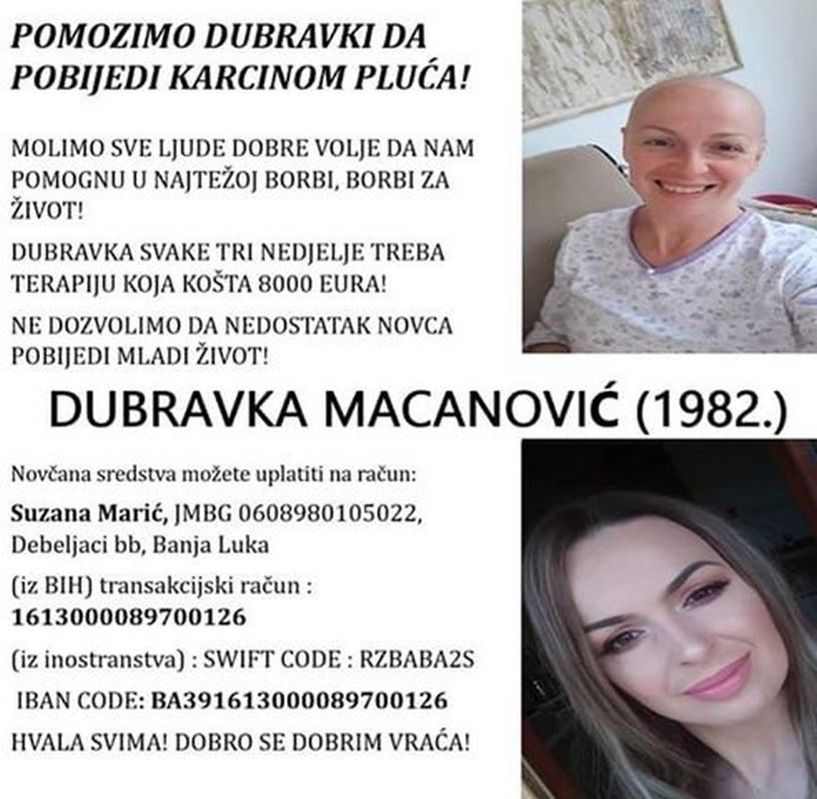 Banjalučanka Dubravka Macanović, koja ima 37 godina, boluje od karcinoma pluća. Njeno liječenje uključuje i terapiju, svake treće nedjelje, a koja košta 8 000 evra.